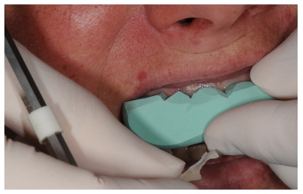 Per meglio valutare l'integrazione del futuro manufatto nel complesso architettonico della bocca e nell'armonia estetica del volto, andiamo a riprodurre, nella bocca stessa della paziente, la forma determinata in laboratorio.
