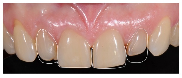 Sulla fotografia del sorriso cominciamo a definire i contorni e i limiti del futuro restauro, iniziando una prima analisi estetica delle forme e delle simmetrie dentali e delle parabole gengivali.